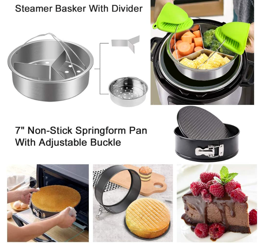 • ★[21 Pcs Instant pot accessories] Pressure cooker acessories provide all you needs for delicious foods. It includes 1 Large capacity steamer basket, 1 Springform Pan, 1 Steamer basket with divider, 1 Egg Bites Mold, 1 Stackable Egg Steamer Rack , 1 Steamer Rack Trivet with Heat Resistant Handles, 1 kitchen Tong, 1 Silicone Spatula, 2 Oven Mitts,3 Magnetic Cheat Sheets,1 CookBook(Instruction & Recipes), 6 in 1 Measuring Spoons,1 Gift Box,1*60 Pcs Parchment Steamer Papers Liners