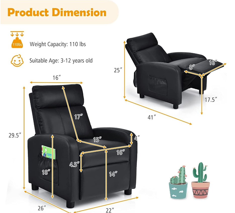 Multipurpose & Adjustable Reclining Chair: Designed with a push-back reclining function, the backrest of this lounge chair is adjustable from 90° to 130°, which allows kids to read books, play games, watch TV or take a rest. Meanwhile, the retractable footrest provides extra support and comfort for kid's legs and feet.