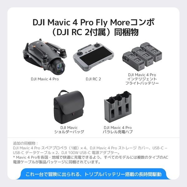 付属品‎DJI 100W USB-C 電源アダプター x 1, DJI Mavic 4 Pro x 1, DJI Mavic 4 Pro インテリジェント フライトバッテリー x 3, DJI Mavic 4 Pro ストレージ カバー x 1, DJI Mavic 4 Pro スペアプロペラ(1組)x 4, DJI Mavic 4 Pro パラレル充電ハブ x 1, DJI Mavic ショルダーバッグ x 1, DJI RC 2 x 1, USB-C − USB-C データケーブル x 2