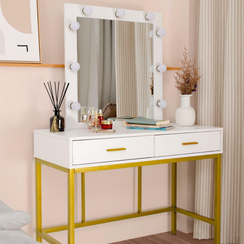 • DURABLE AND AESTHETIC: Crafted from strong golden metal frame (0.98 inch) and E1-graded MDF wood, this makeup vanity with lights takes on both contemporary and classic silhouette in your home and serve you for years to come.