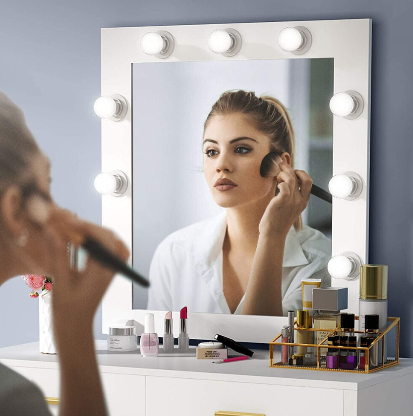 • STYLISH YET FUNCTIONAL: This elegant lighted vanity table with mirror and 9 Hollywood style LED Light Bulbs will glamorize your bedroom or changing area that you've always dreamed of owning. Get the full picture in the large mirror with soft and non-dazzling light to prep for the coming day or primp for a night out.