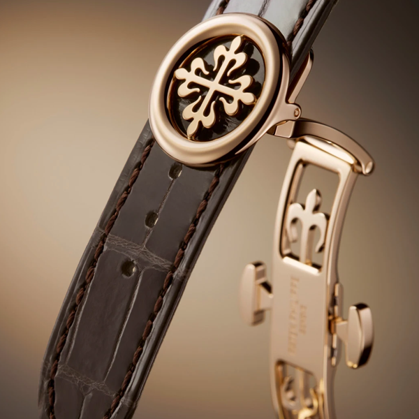 Alligator leather with square scales, shiny dark chestnut. Rose gold patented triple-blade fold-over clasp